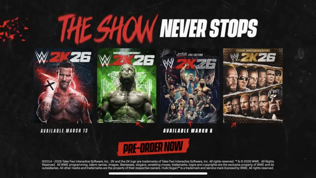WWE 2K26 dijadwalkan rilis secara global pada Maret 2026. Game ini akan tersedia untuk: